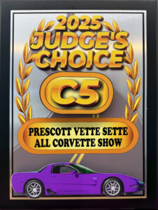Seven Corvettes from Corvettes of Bakersfield represented our club. We had a scary start with two of our cars picking up screws in our tires before leaving Bakersfield. Some of us visited the Grand Canyon via the Williams Train on the way to Prescott. Others drove through challenging weather with heavy desert rains. It rained off and on during the car show, but we didn’t melt. We had a great time and a safe trip home. Kim Miller won the Judge’s Choice award for her purple C5.